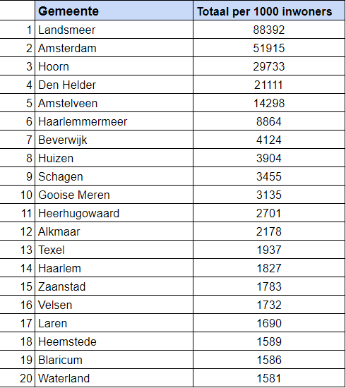 - In de gemeente Landsmeer wordt de hoogste totale waarden aan prijzen per 1000 inwoners gewonnen.