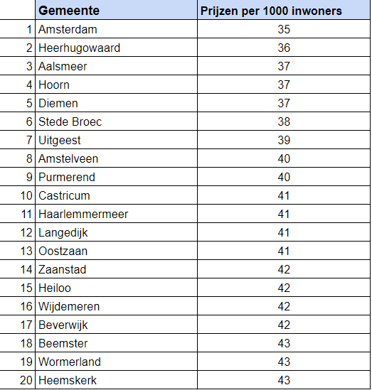Totaal overzicht gewonnen prijzen in Noord-Holland per 1000 inwoners